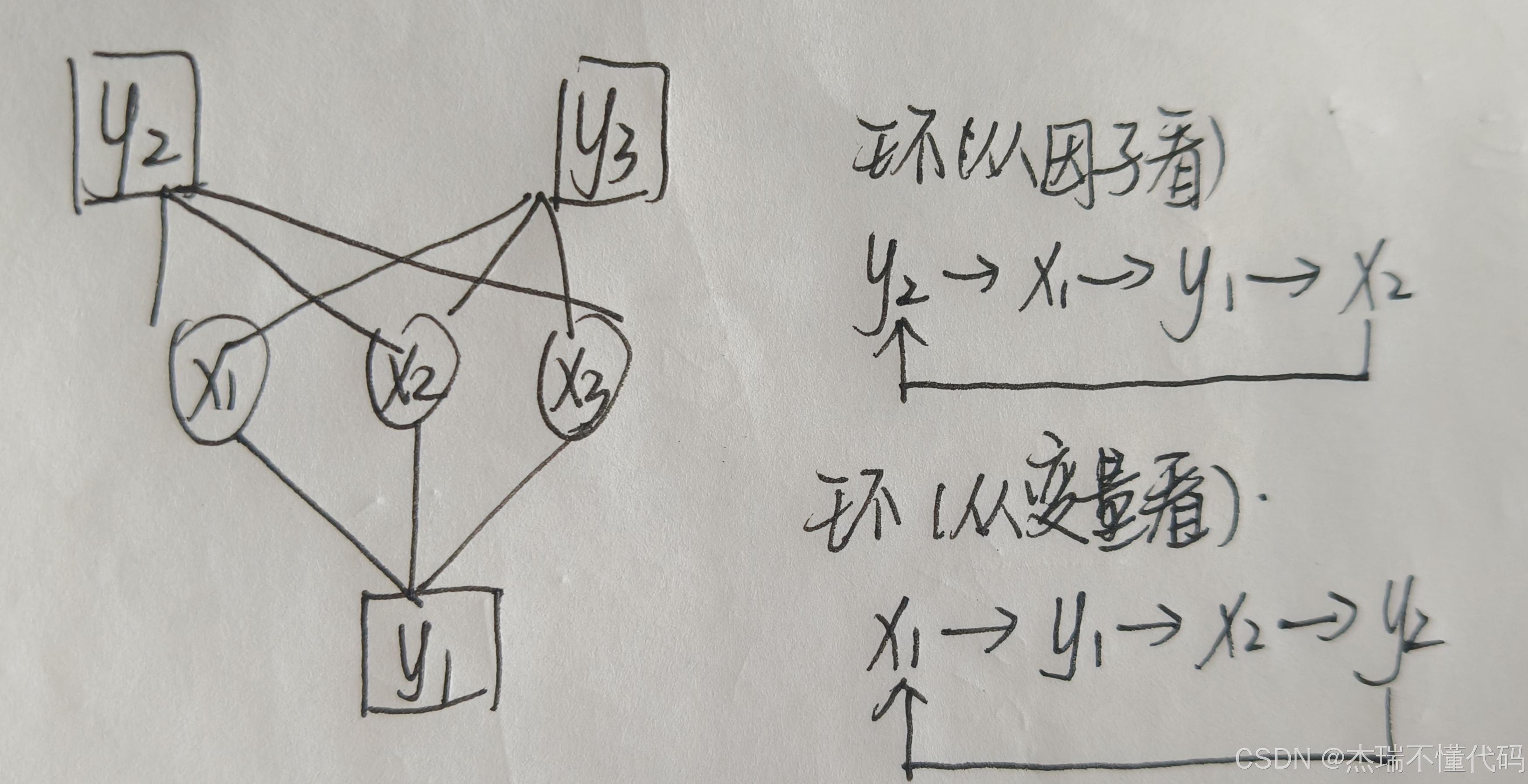 我们通过以下方式来理解这个回声,首先从直观上可以看下面这个图,由于很稠密,因此存在很多环,我在图中只是写了其中的一个,实际上还有像 y 1 → x 1 → y 3 → x 2 y_1→x_1→y_3→x_2 y1→x1→y3→x2这样的很多类似的环路,这都会给BP的估计带来麻烦,因为引入了回声(之前的变量节点接收到自己的回声,会更确信这个信念是对的,因此就会往错误的方向进行更新)。