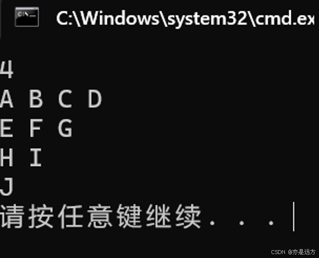 实验题目(4):编写程序exp2_4.c,输出n行由大写字母A开始构成的三角形字符阵列。