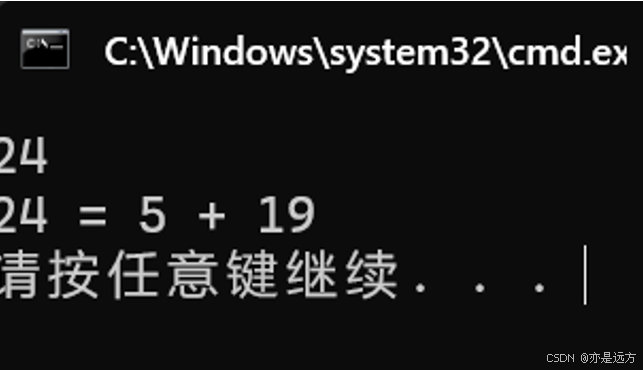输出格式:在一行中按照格式"n = p + q"输出n的素数分解,其中p ≤ q均为素数。这样的分解不唯一(例如24还可以分解为7+17),要求必须输出所有解中p最小的解。