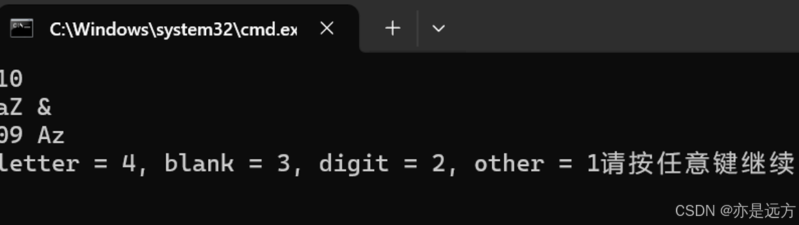输出格式:在一行内按照 letter = 英文字母个数, blank = 空格或回车个数, digit = 数字字符个数, other = 其他字符个数 的格式输出。请注意,等号的左右各有一个空格,逗号后有一个空格。