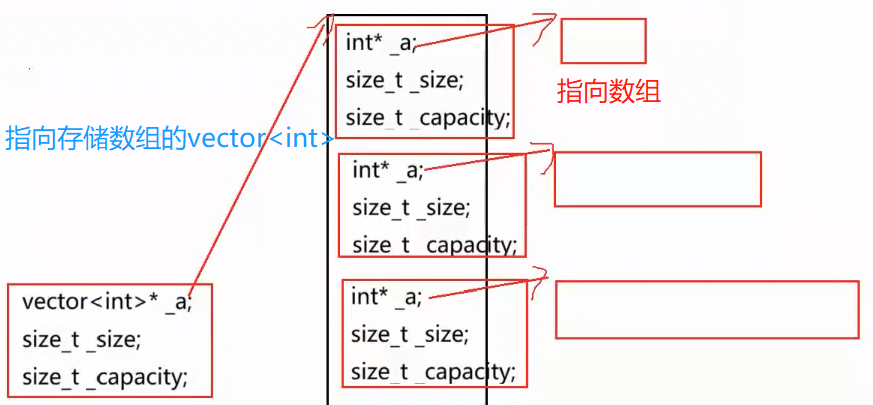 后者的底层指针为vector<int>* 类型(如图右下),该指针指向一片存储vector<int>的空间------每个元素都是一个vector<int>对象,