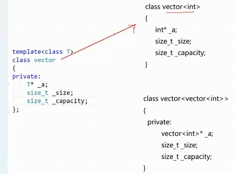 如图,那么首先,vector的类模板就会实例化两个模板类,首先是vector<int>类型,,然后是vector<vector<int>>类型