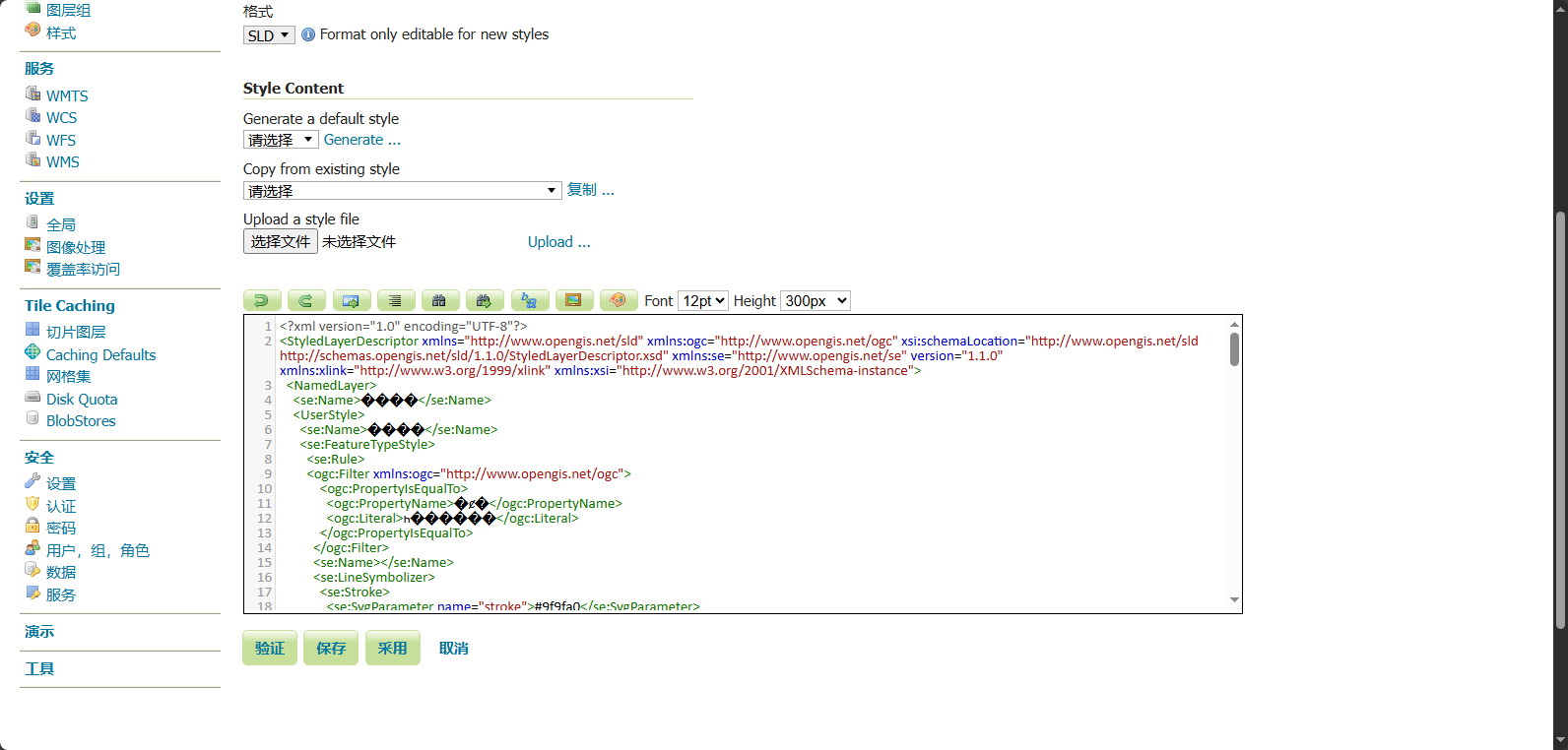 SLD样式设置了UTF-8编码,依旧是乱码。经过我多天的研究,这个编码是控制样式在前端的编码,保证前端显示不乱码,而这个SLD乱码与系统对文件的编码有关系。于是我找到这个SLD文件,查看了一下这个文件的编码方式是ANSI,我修改了编码方式为UTF-8以后,替换SLD文件,结果成功了,无需重启服务。