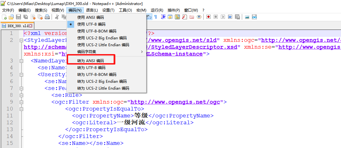 打开原始文件,一般是放置在 \data_dir\styles文件夹中,找到sld文件打开查看一下是否乱码,如果不乱码的话,找到如下界面,Style的样式管理器并重新复制粘贴代码,保存。如果是乱码的话,可以尝试将打开的文件(文本编辑器打开的话)另存为ANSI编码的sld文件;用Notepad++打开的话直接修改编码方式为ANSI保存,保存如下图所示。
