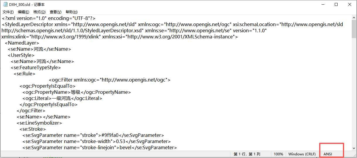 - 2.Windows中如果想要中文字正常显示有两点需要注意,在SLD文件的开头要设置编码方式GBK或者GB2312,geoserver在Windows系统中默认将SLD文件保存为ANSI编码的形式