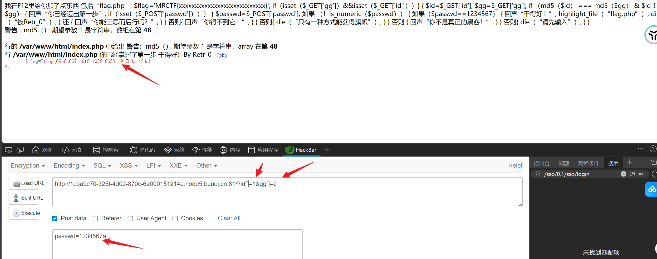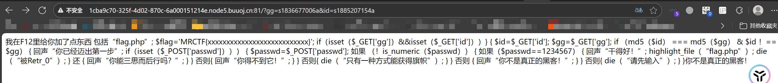 第一个id和ggmd5后强相等,那我们就有俩种思路了,一种是哈希碰撞还有一种就是利用php的md5的特性来进行绕过,我们这里采用的是第二种,然后passwd由于是弱相等所以就很简单了直接1234567后面随便加个字母就可以得到flag了