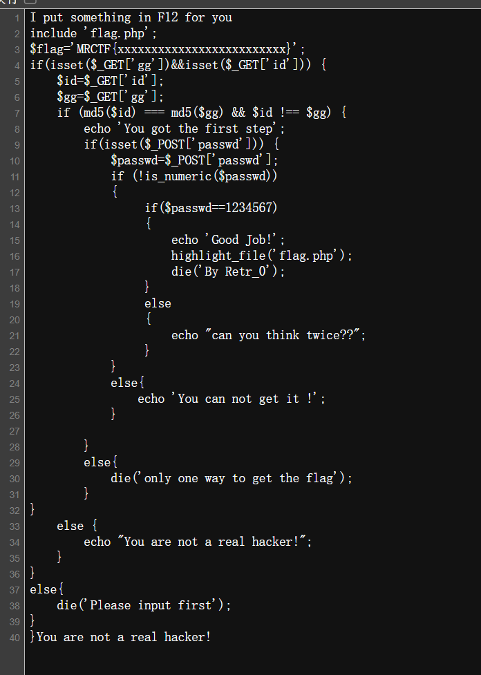 整体快速通读一遍然后定位到flag,在层层往上推发现,需要满足md5(id) === md5(gg) && id !== gg还有passwd不能是纯数字而且值是弱等于123456的