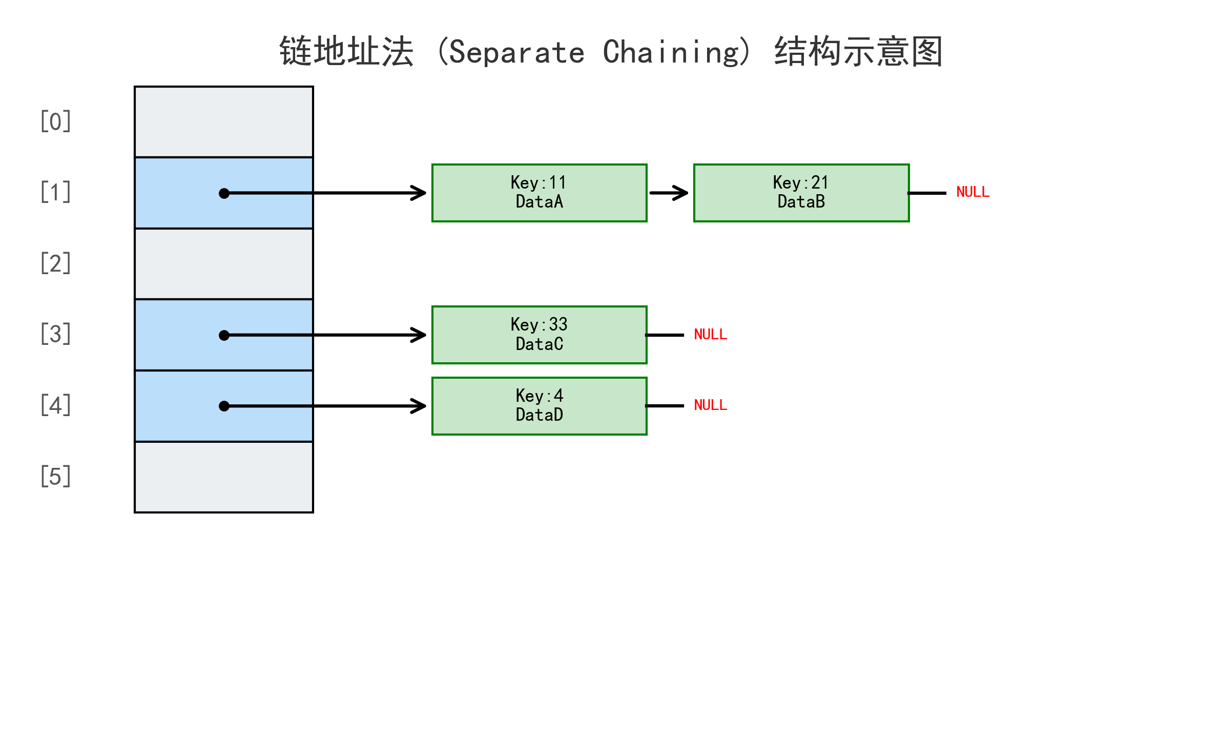 本文实现的哈希表采用链地址法(Separate Chaining)来解决哈希冲突,这是一种非常常用的哈希冲突解决方法。
