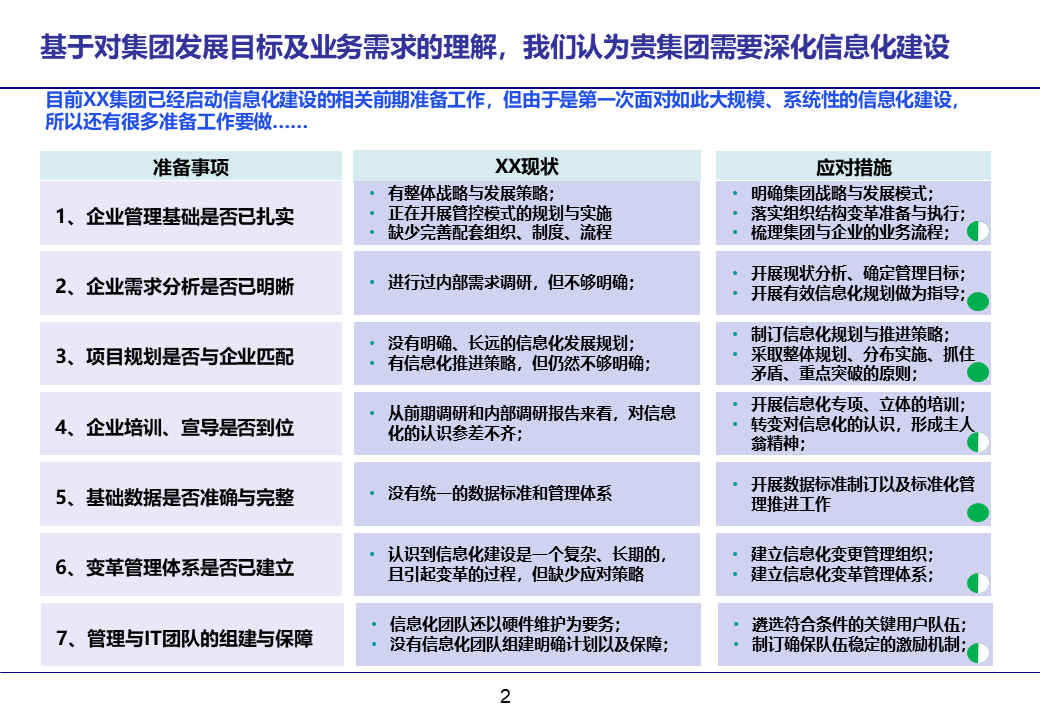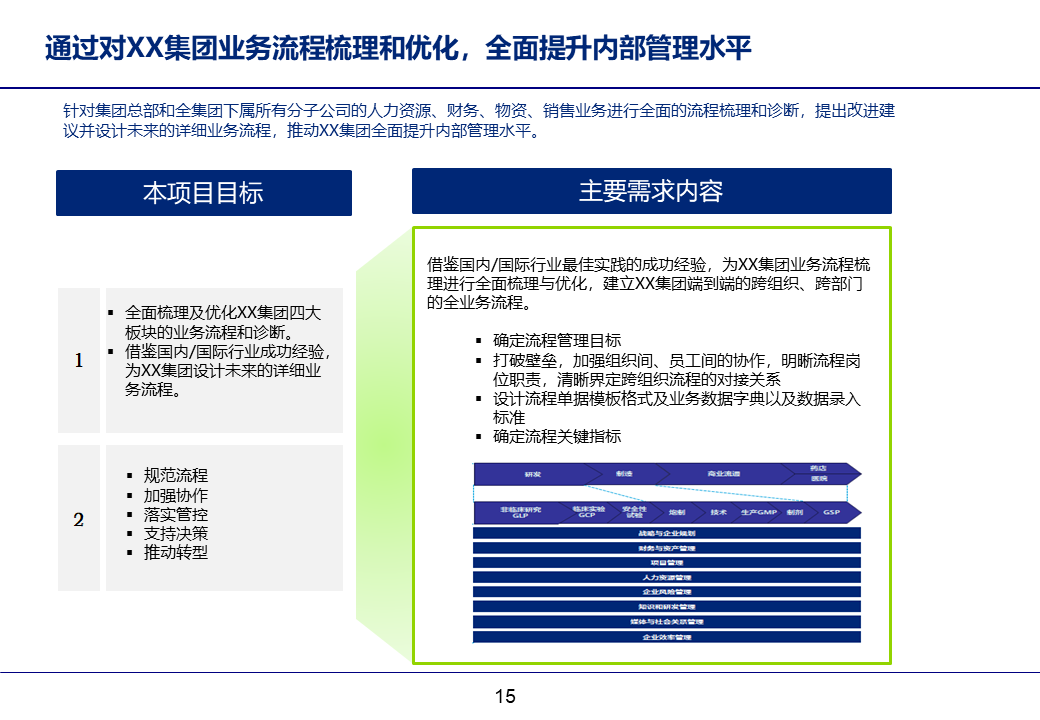 其次,审视企业管理基础,发现存在组织、制度、流程不完善等问题。因此,需系统梳理集团与企业的业务流程,开展深入的现状分析,明确管理目标。尽管已进行内部需求调研,但需进一步细化与明确,确保需求精准对接。