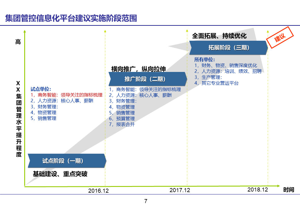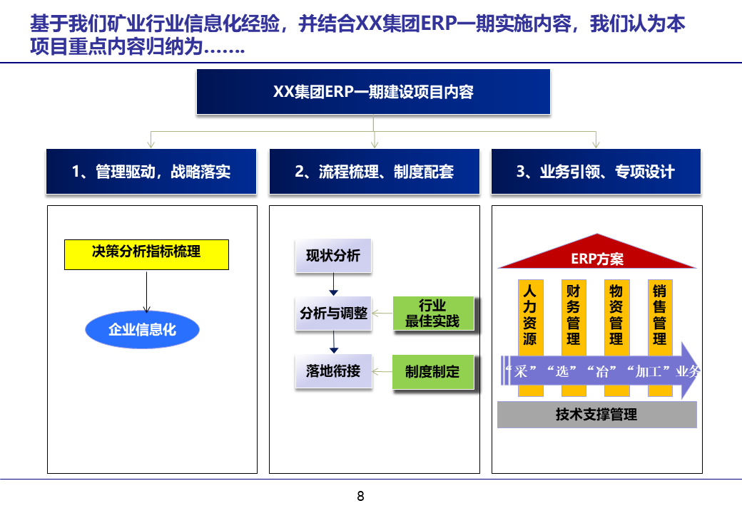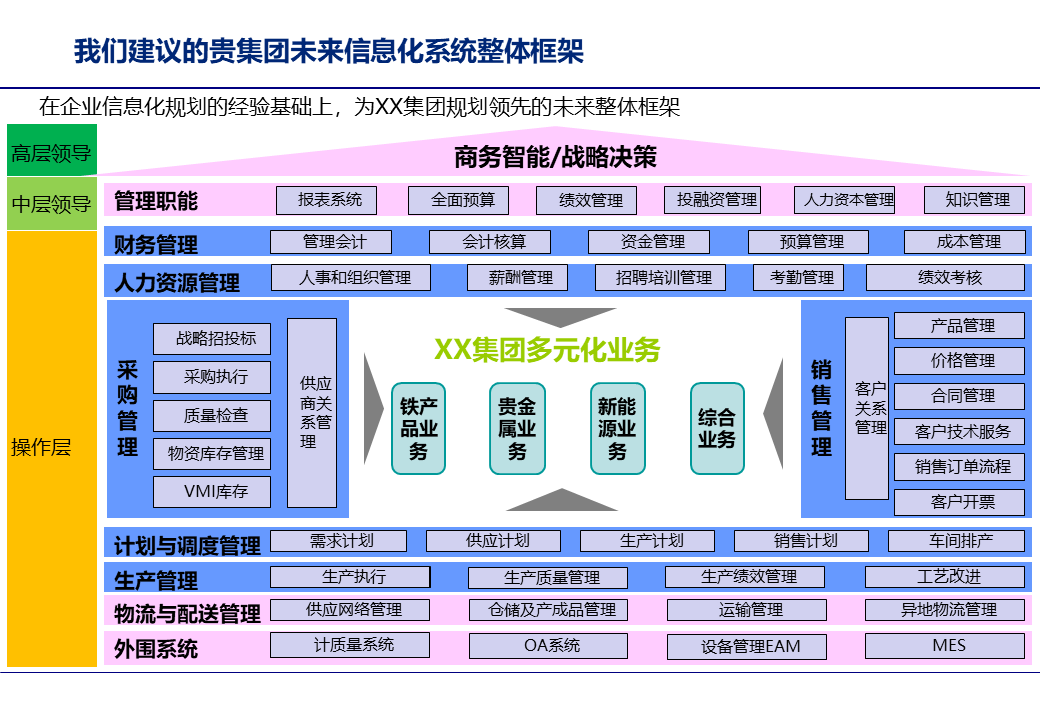 针对集团的信息化建设需求,我们提出以管理驱动为核心,通过流程优化构建一体化ERP集中管控平台。鉴于集团正处于信息化建设初期,面临诸多挑战,需从战略到执行全面布局。