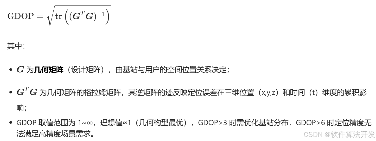 部署方案的综合性能评价指标(GDOP); GDOP是定位系统中"几何构型对定位误差影响程度"的量化指标,本质是定位误差协方差矩阵迹的平方根,数学定义为: