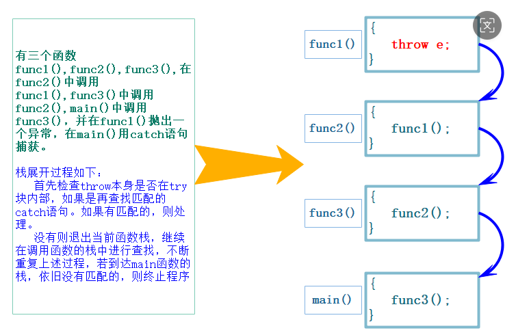 - 首先 检查 throw 本身是否在 try 块内部,如果是再查找匹配的 catch 语句 。如果有匹配的,则调到 catch的地方进行处理。