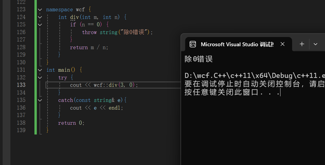 throw后面没有跟任何东西的意思是:捕捉这个异常后,先处理catch里面的内容,即delete释放资源,然后throw重新抛出这个异常(除0错误)