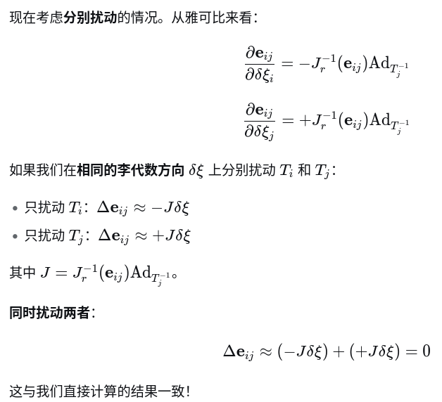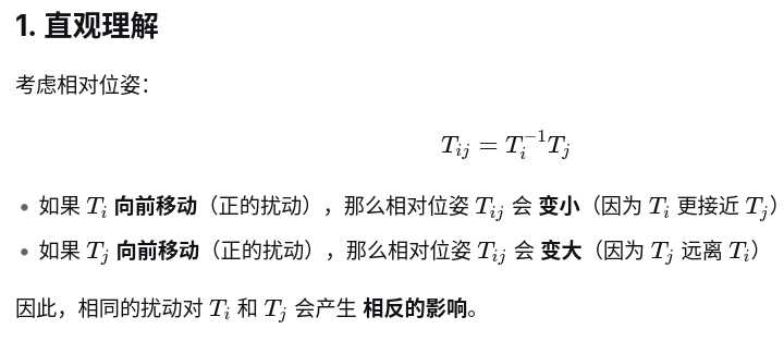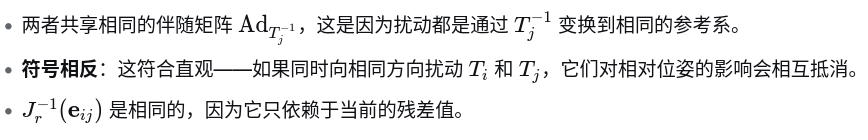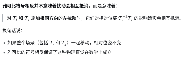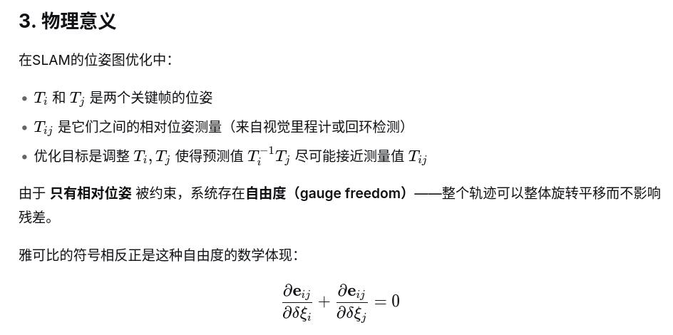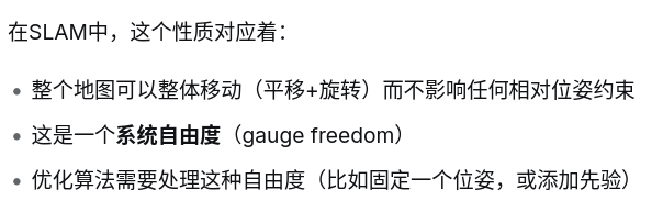 简单的总结为: 只有扰动相同时,残差会保持不变,雅可比为0,这也就意味着相对位姿无法消除零空间