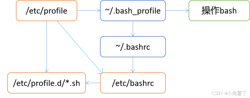当用户登录 Linux 系统时, Shell 会作为登录 Shell 启动。此时的登录 Shell 加载环境变量的顺序如下图所示。