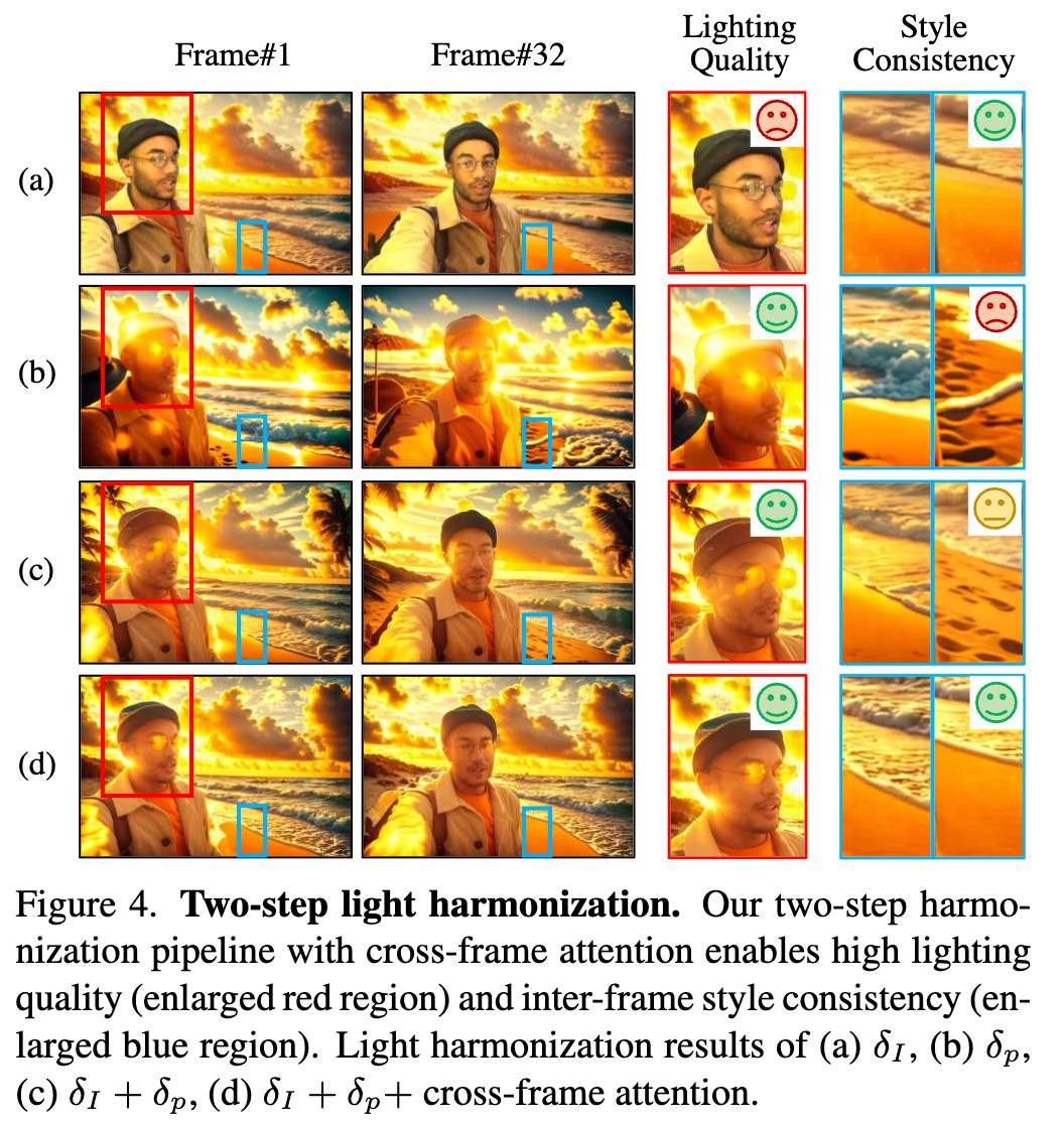 为了在 和 的光照效果之间取得平衡,同时利用来自 的时间一致视觉引导,本文提出了一个两步协调流程,如图2(b)所示。第一步,获得图像引导结果 。第二步,采用SDEdit的思想,通过使用 对其去噪来细化 的光照。具体来说,我们使用DDPM前向过程向 添加 步()的噪声,然后在 和 的条件下使用 对其去噪 步。如图4(c)所示,前景光照得到了很好的增强。然而,这种逐帧处理无法确保风格一致性(例如,海滩外观不一致以及两帧中棕榈叶位置的变化)。为了缓解这个问题,我们对 和 采用了跨帧注意力。将 的自注意力层替换为跨帧注意力层,其中所有帧从第一帧聚合键和值特征,而不是从它们自身聚合。结果,风格一致性得到加强,如图4(d)所示。请注意,我们的流程允许通过 来调整光照效果,即较大的 会产生具有强烈光暗效果的结果。