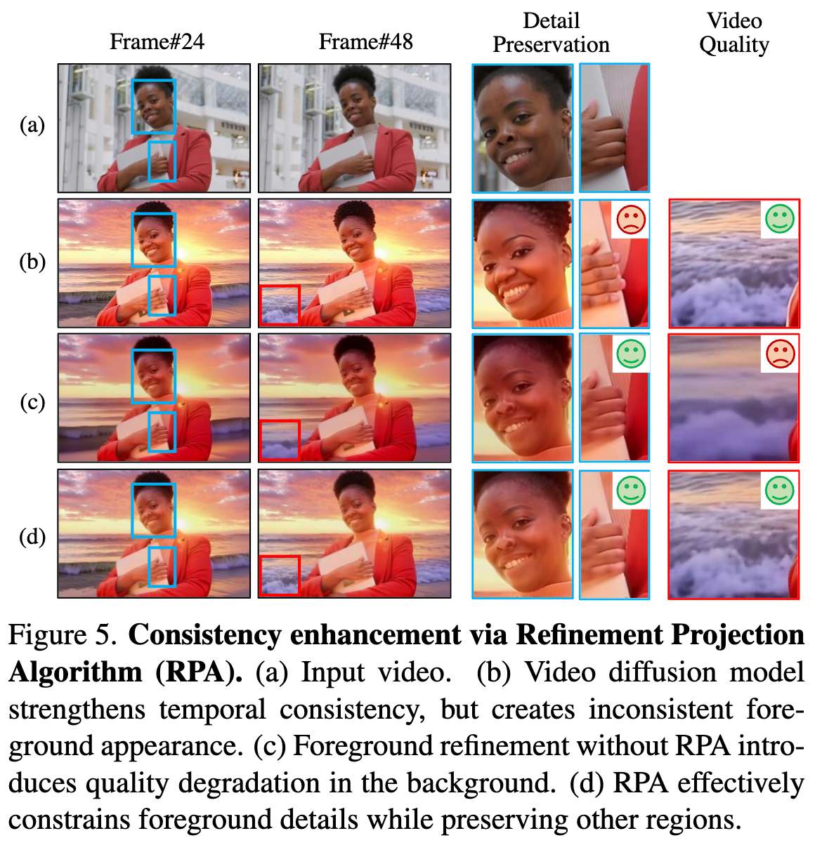 RPA使用一个确定性的 来代替随机的 ,该 经过计算以确保对 的完美重建。具体来说,假设一个完美重建 。注意 和 都是可获得的,因此可以确定性地计算 。然后,对于细化后的视频 ,获得 ,最终的投影解为 。在算法2中总结了提出的RPA。关键见解是,如果不应用细化(即 ),此投影将使 完全等于 。这种对齐属性确保了结果视频的背景区域几乎保持不变,仅细化了前景细节,这也由图5(d)验证。
