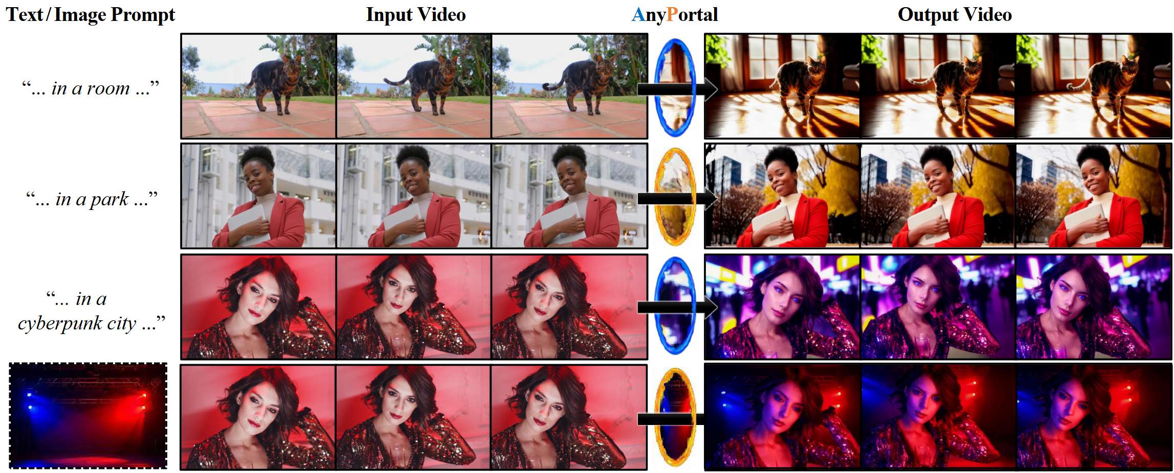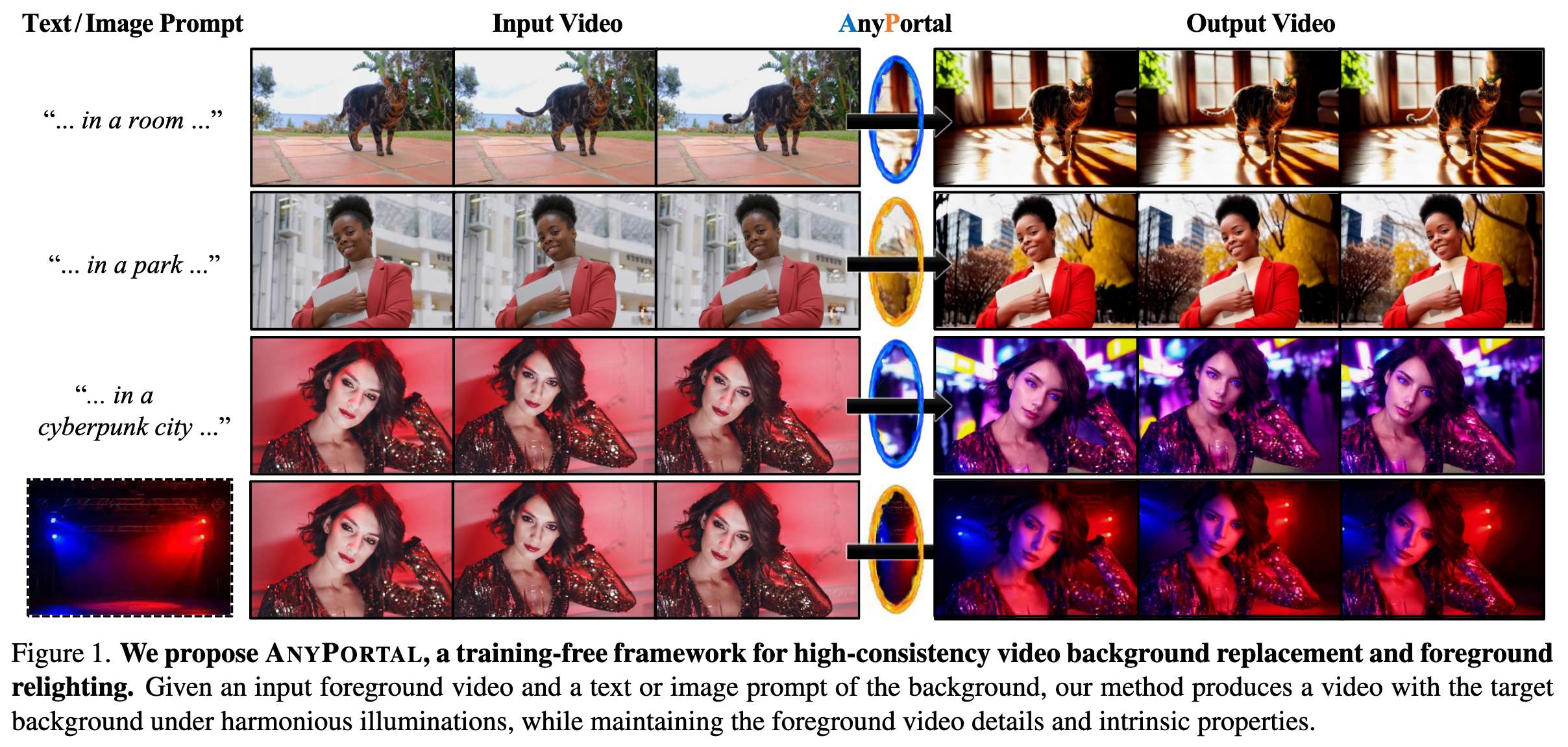 图 1.ANYPORTAL,这是一个用于高一致性视频背景替换和前景重新照明的免训练框架。给定输入的前景视频和背景的文本或图像提示,本方法在和谐的光照下生成具有目标背景的视频,同时保持前景视频细节和内在属性