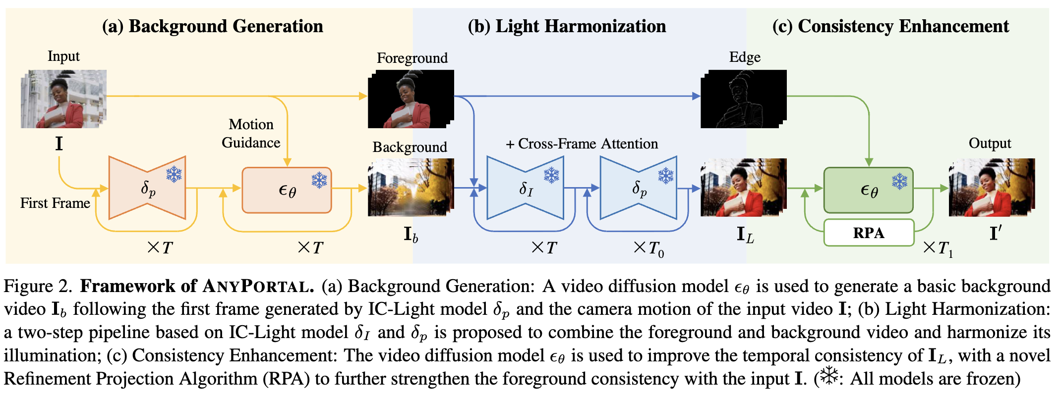 在第一阶段,借助预训练的视频扩散模型 生成一个背景视频 ,该视频与 的相机运动相匹配。第二阶段基于我们提出的两步IC-Light流程,在新的背景中协调前景物体的光照,以产生一个粗粒度视频 。第三阶段引入了一种新颖的精炼投影算法(RPA),该算法解决了帧间的不一致性问题,并细化前景细节以匹配 的细节,最终生成视频 。