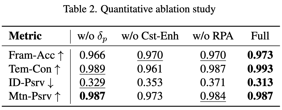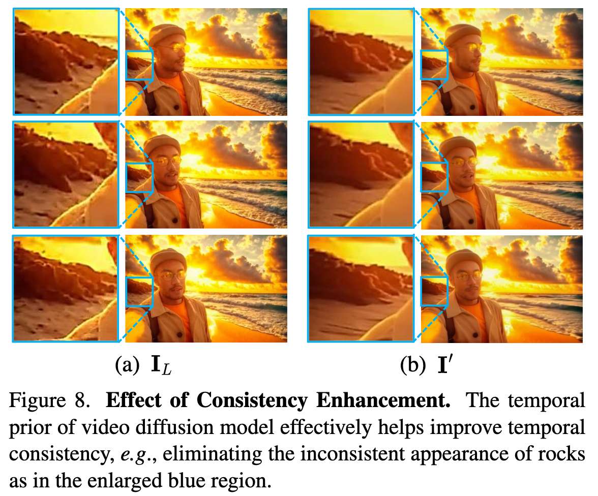 时间先验。一致性增强(Cst-Enh)阶段优化了第二阶段生成的视频的前景细节和整体时间一致性。如表2所示,不使用Cst-Enh时,Tem-Con显著下降。如图8所示,的背景中岩石存在不一致问题。通过利用视频扩散模型的强先验,该问题在第三阶段结果中得到有效解决。