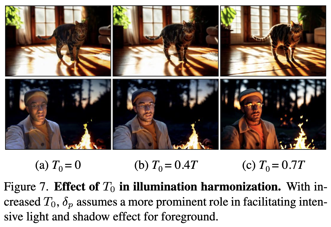 两步协调。在图像协调阶段,采用IC-Light的δ和δ为视频提供改进的照明,使前景能更好地融入背景。如表2所示,朴素的一步协调(即不使用δ或)会导致视频模型生成光照不够自然的前景。随着增大,δ在实现更自然前景光照中的作用逐渐增强,如图7所示。