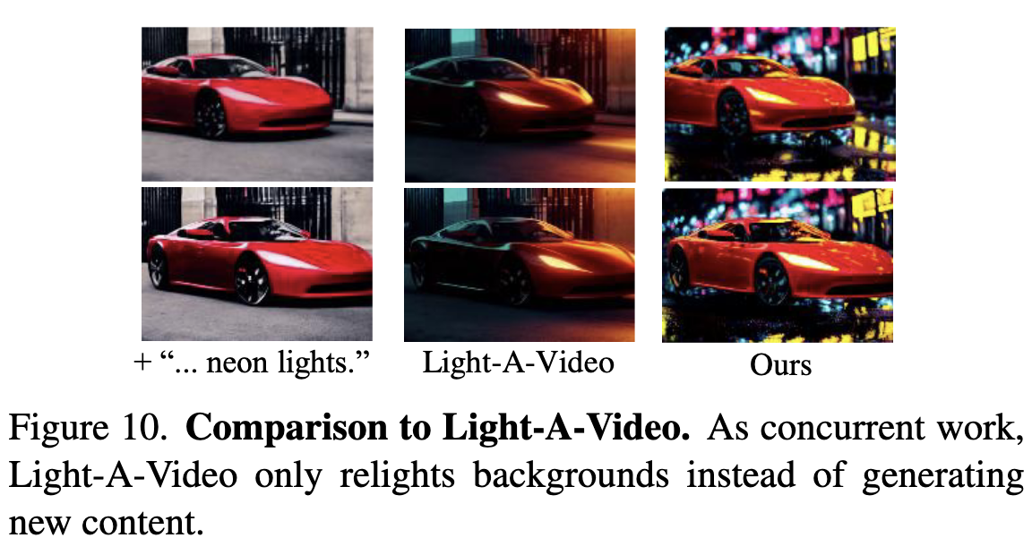 与Light-A-Video的比较。在下图10中进一步提供了与同期工作Light-A-Video的视觉对比。两种方法均基于CogVideoX,生成质量相当。然而,Light-A-Video的CogVideoX实现仅能对现有背景进行重新打光,而本文的方法能生成新的背景内容。