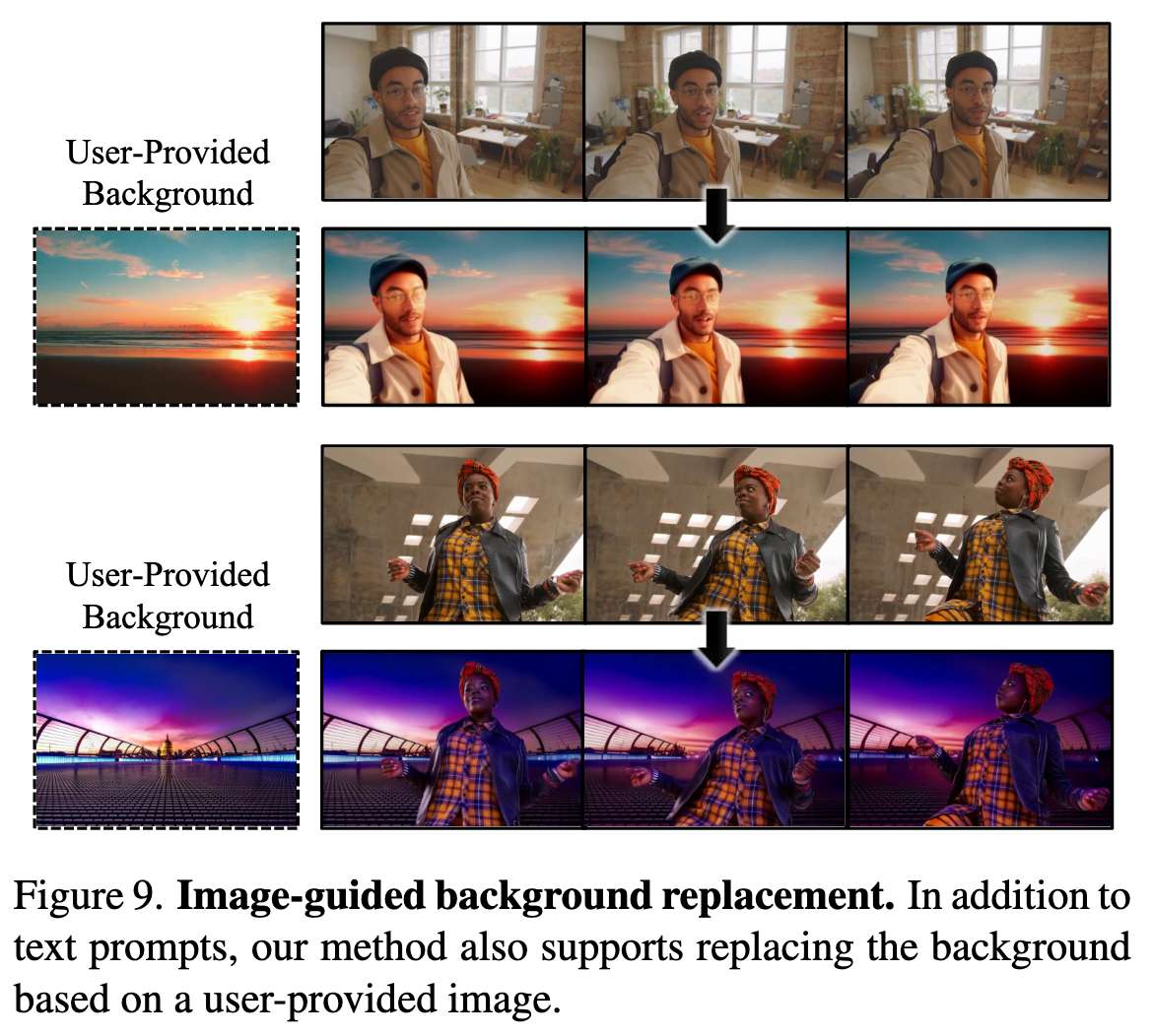 图像引导的视频背景替换。本文的方法可轻松适配图像提示。在第一阶段,使用δ和用户提供的背景场景图像生成第一帧,后续阶段则与文本提示完全相同。图像引导结果如下图1和图9所示。