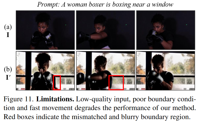 (1)低质量输入(如低分辨率/模糊视频)会减少高频细节的迁移,导致结果模糊(例如图11中头发部分);(2)前景-背景边界不清晰会导致修复结果不匹配,并在主体周围产生扩大化的模糊区域;(3)快速运动会对扩散模型带来挑战,在左臂等部位引发伪影。