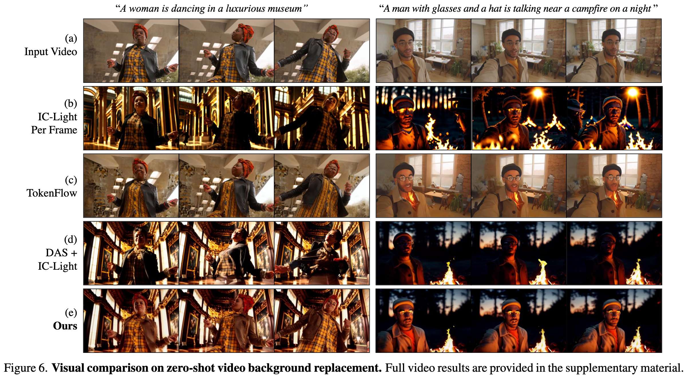 实现细节。使用 CogVideoX 作为视频扩散模型 εθ,并使用 IC-Light作为图像背景替换模型 δp 和 δI。我们设定 T = 20,并将强光照效果和弱光照效果的 (T₀, T₁) 分别设为 (0.7T, 0.7T) 和 (0.4T, 0.4T),以满足不同场景的需求。所有实验均在单个 NVIDIA 4090 GPU 上进行,并为 CogVideoX 启用了 CPU 卸载。测试视频统一调整为 480×720 分辨率,并裁剪为 49 帧以符合 CogVideoX 的规格要求。每个视频的推理时间约为 12 分钟(若关闭 CPU 卸载且 GPU 内存更大,还可进一步加速)。