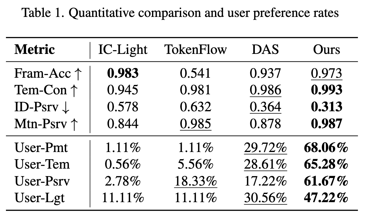 下表1给出了定量评估结果。IC-Light 实现了最佳的 Fram-Acc,这是因为它专门针对背景替换任务进行了训练,无需考虑时间一致性。本文的方法取得了第二佳的 Fram-Acc,并在所有其他指标和用户偏好上均获得最佳结果,在单帧重新打光质量和整体视频流畅性之间取得了良好平衡。