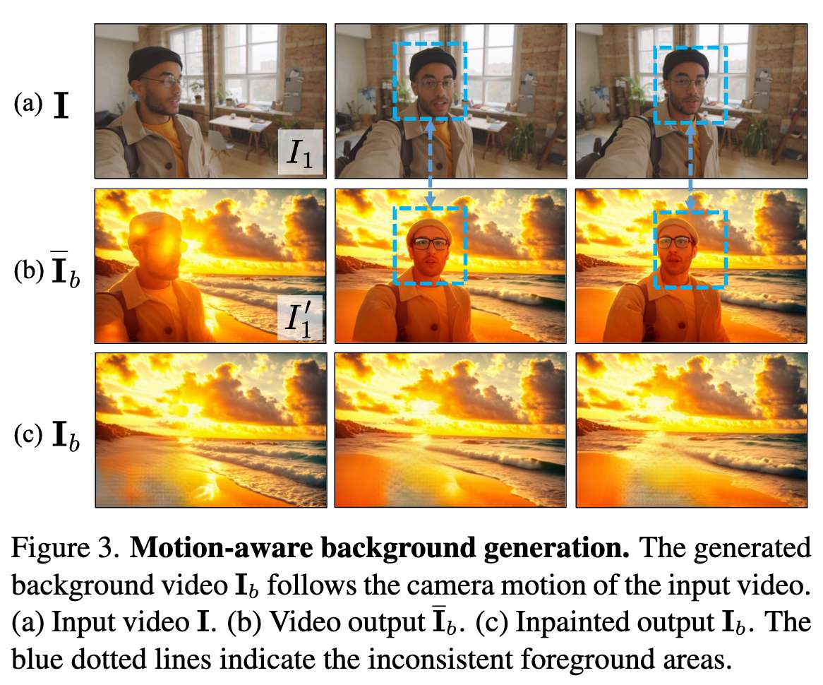 为了将前景与背景无缝集成,第一阶段生成一个基本的背景视频 ,该视频与背景提示词 相对应,并且关键的是,与 的相机运动相匹配。遵循Diffusion-As-Shader (DAS),这是一个基于ControlNet的视频生成框架,它用第一帧和引导视频的运动(追踪的3D点)来指导视频扩散模型。具体来说, 作为引导视频。为了获得第一帧,我们将IC-Light应用于 的第一帧 ,得到 。将DAS应用于后端视频扩散模型,基于 和 生成 。如下图3所示, 具有与输入 相同的相机运动,但其前景物体可能与 显著不同,不能直接用作本文的视频背景替换结果。最后,使用ProPainter移除前景物体,获得基本背景视频 。