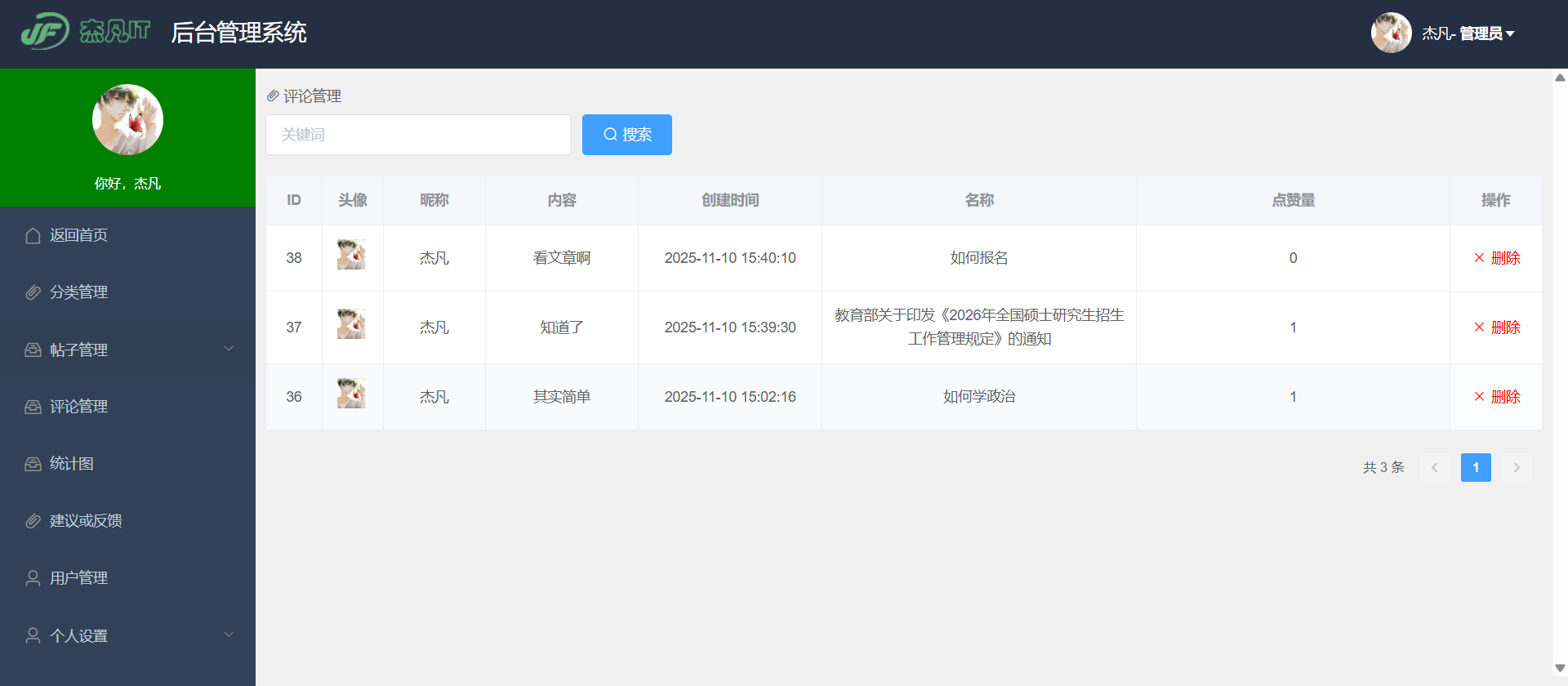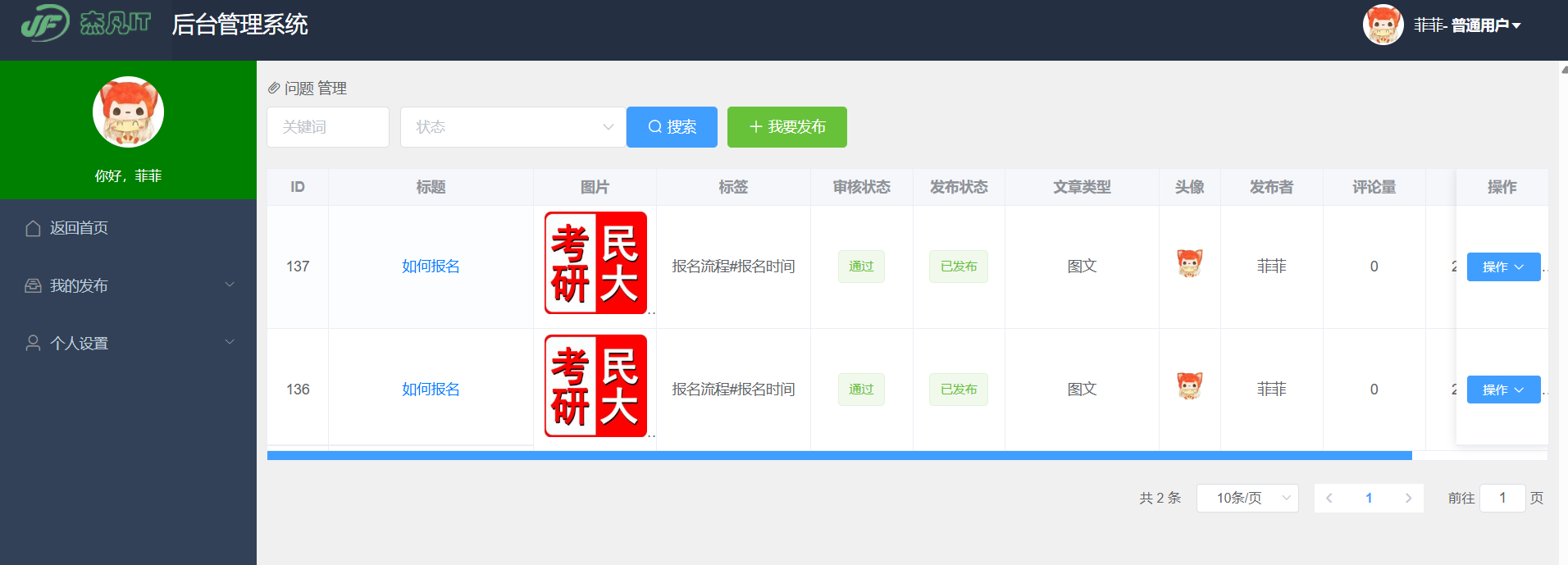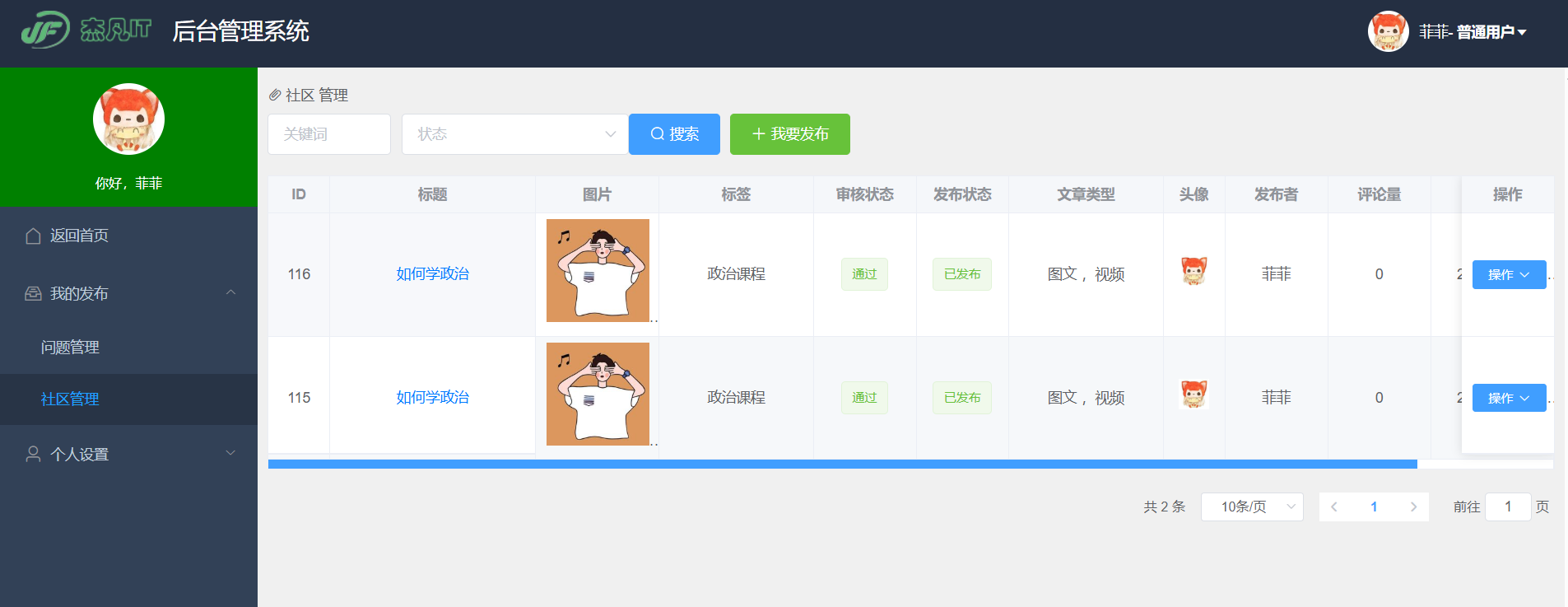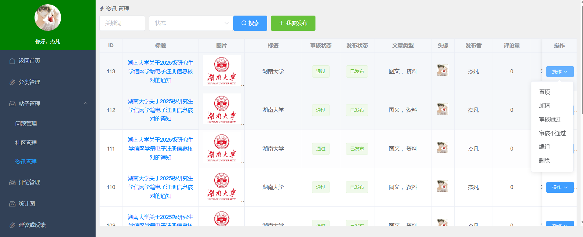 - 内容审核:对用户发布的文章、帖子进行审核(待审、通过、不通过),并填写审核意见。