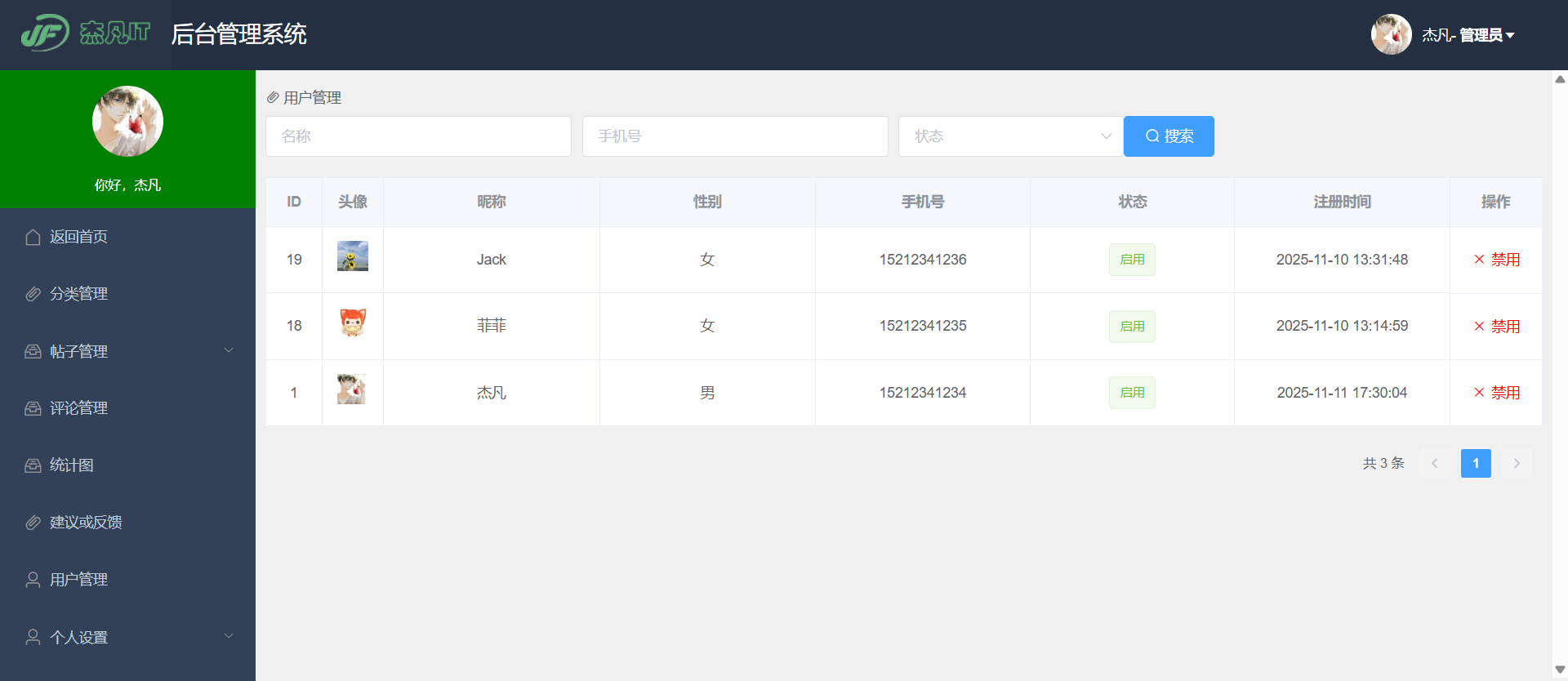 - 用户管理:查看所有注册用户列表,可对用户进行禁用或启用操作,并记录禁用原因。