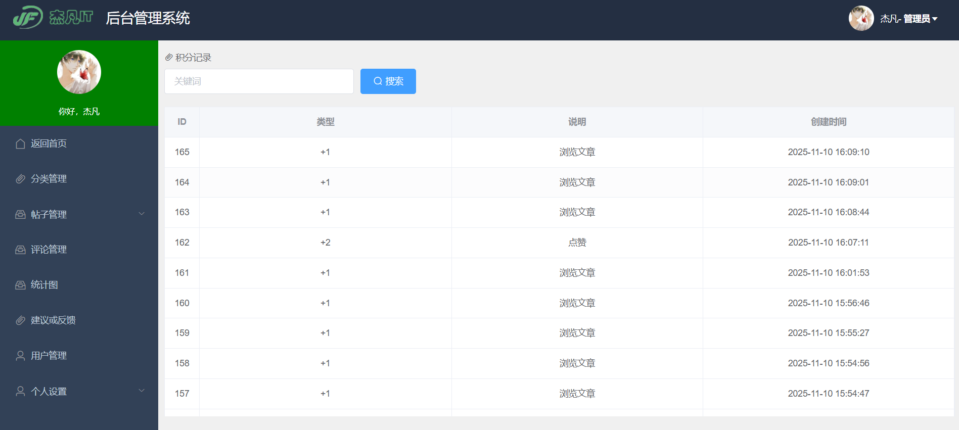- 个人中心:查看自己发布的文章、评论、积分记录等个人数据。