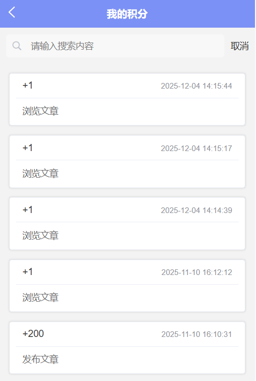 - 积分系统:通过系统行为获取或消耗积分,并可查看积分记录。