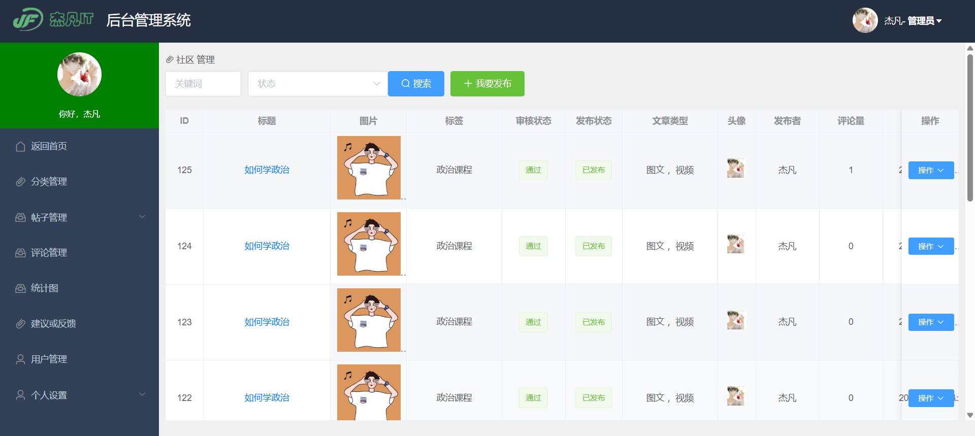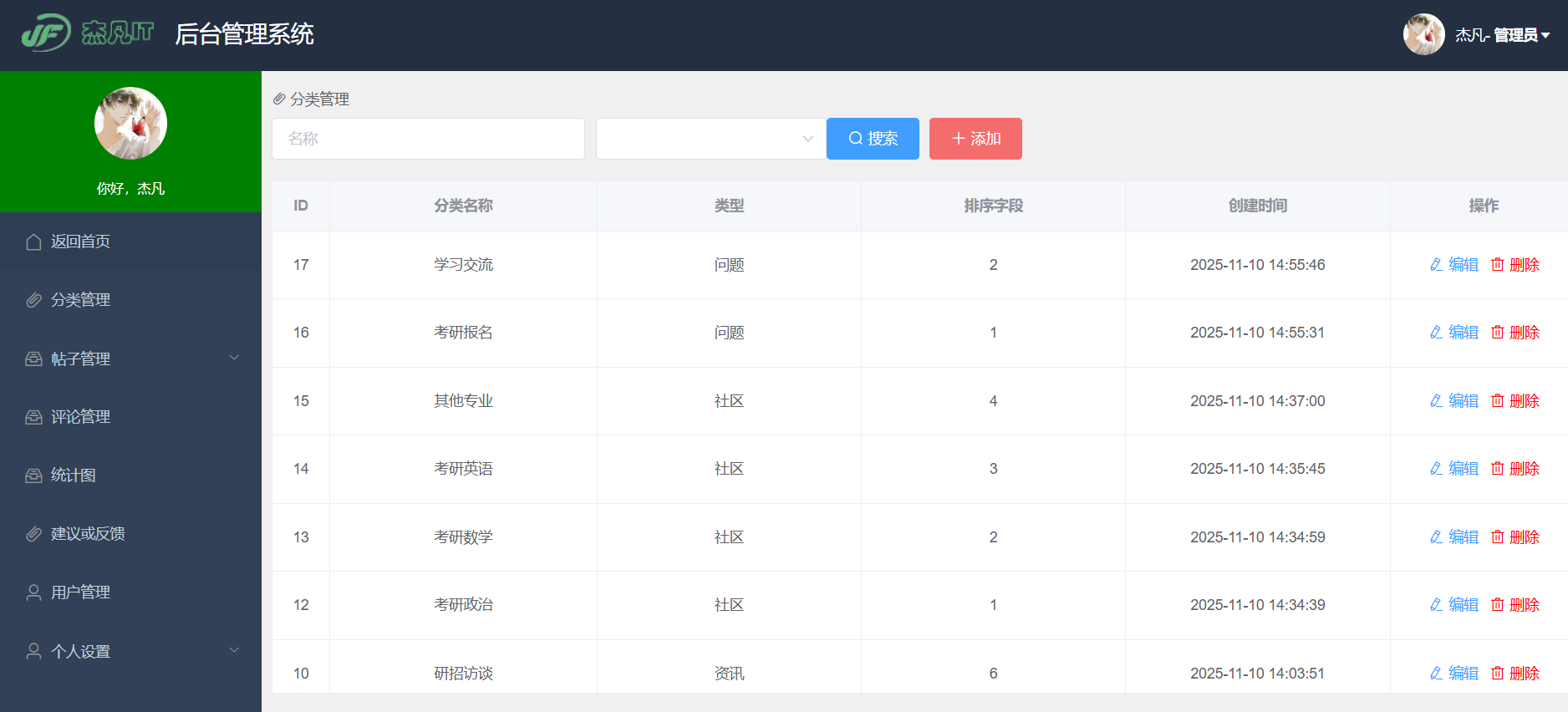 - 分类管理:维护文章的分类列表,包括社区、资讯、问答等类型,并设置排序。
