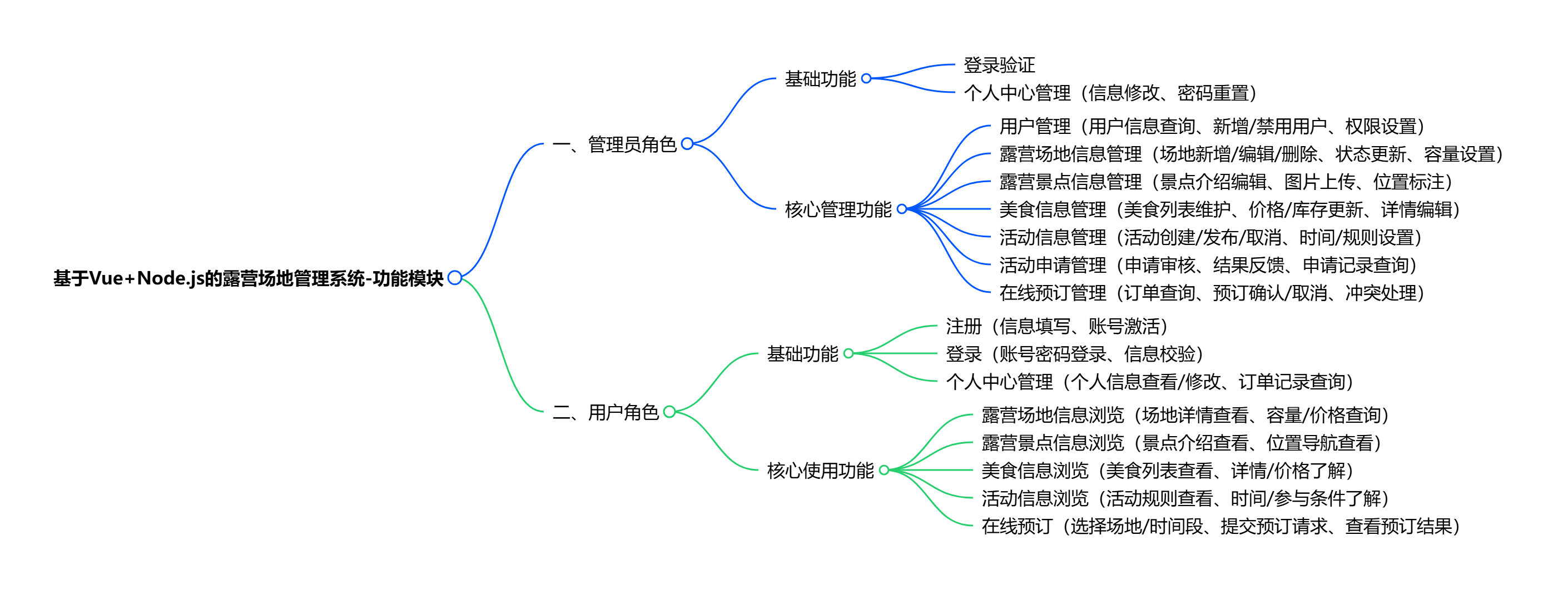 系统主要分为管理员和用户两大角色模块:管理员可完成用户管理、露营场地信息管理、景点美食活动等内容维护以及预订订单处理;用户端则提供注册登录、场地浏览、在线预订、信息查询等核心功能。
