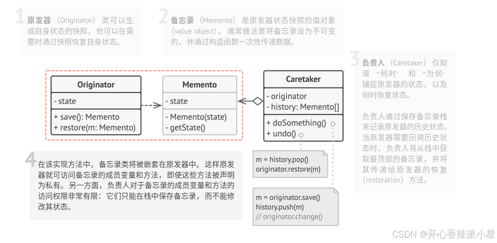 - 负责人(Caretaker):负责保存好备忘录,但不能对备忘录的内容进行操作或检查。