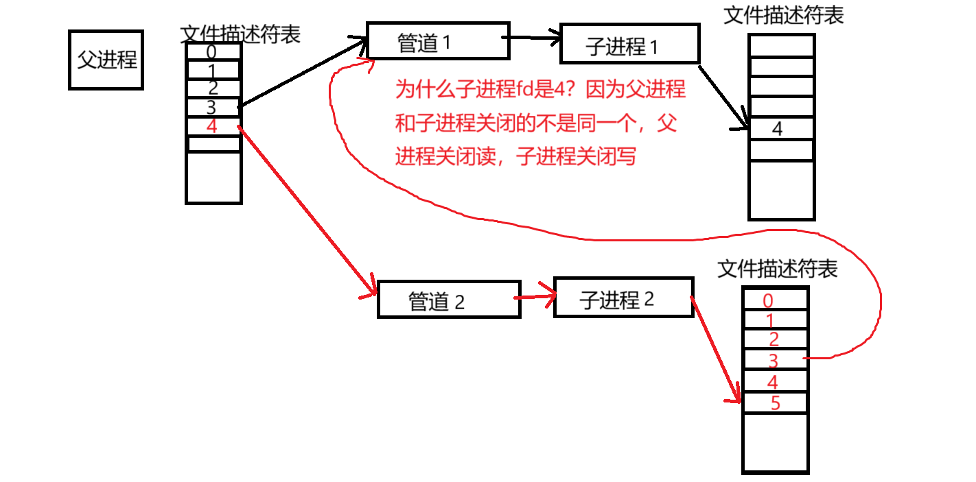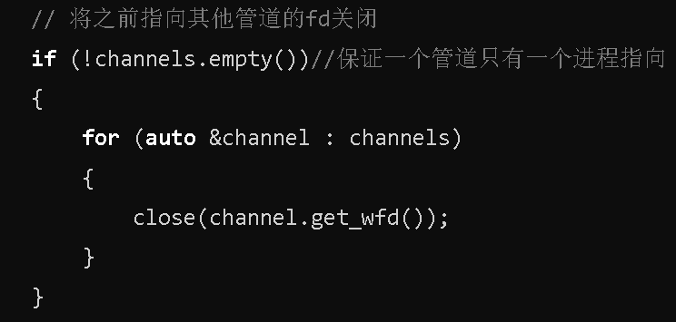 fork使父进程数据拷贝给子进程2,此时子进程2的fd表一定有3,而3是指向子进程1的管道,所以需要将子进程2的fd为3的位置给关闭掉,换句话说,只要channel数组里不为空,就需要将之前的channel中对应的子进程的fd表关闭一些内容。