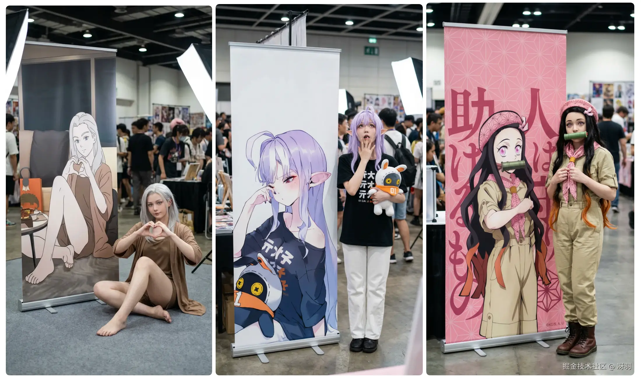 一张电影感的、4K 分辨率的纪实风格照片,画面中一位 Coser 和一个真人大小的易拉宝展架,在熙熙攘攘的动漫展会大厅里并排站立。
