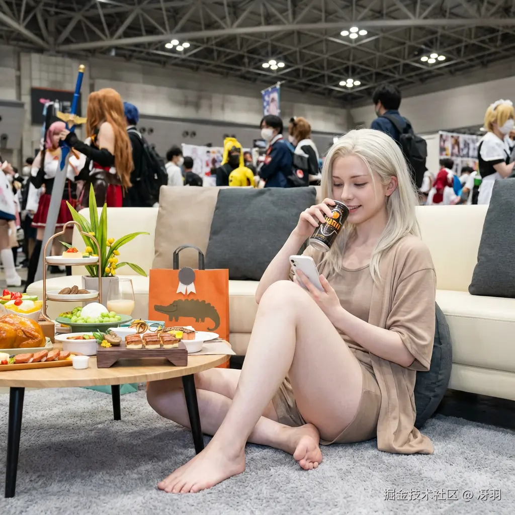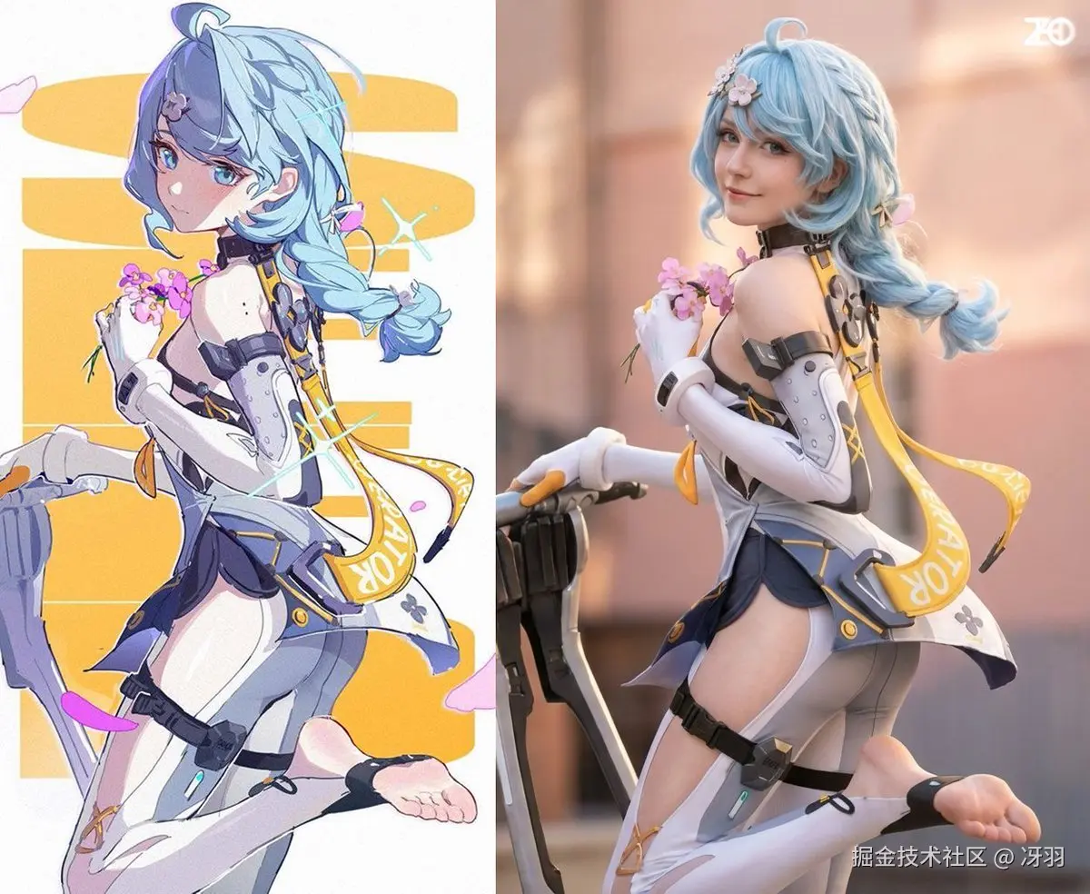 精确复制原插图中的姿势、体态、手势、面部表情和拍摄角度,生成一张女孩在 Comiket 上 cosplay 这个插图的高度细节照片。保持相同的角度、透视和构图,不做任何偏离。