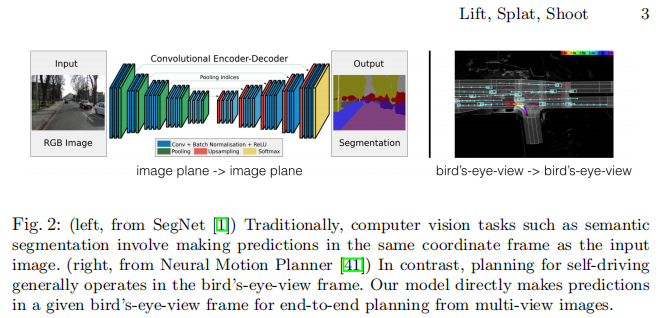 - 提出了 "Lift-Splat-Shoot" 三步流程,实现了从多视图相机到 BEV 语义表示的端到端可微分映射,天然满足多视图感知的三大对称性;