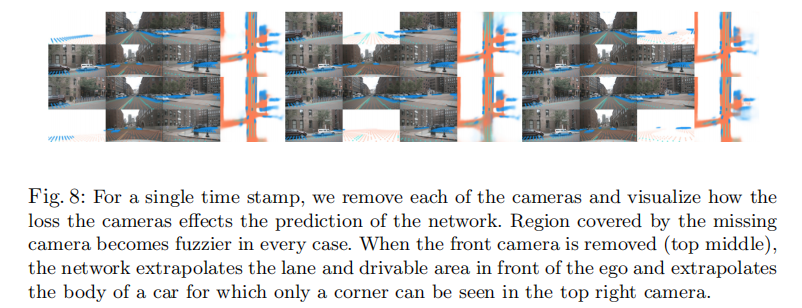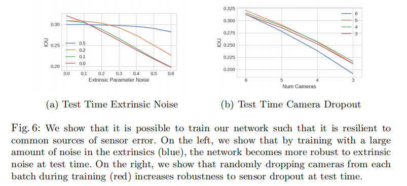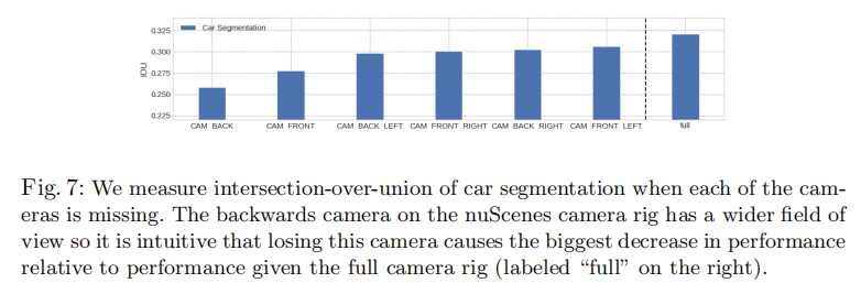 图 7 展示了单个相机缺失时汽车分割 IOU 的变化:
