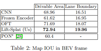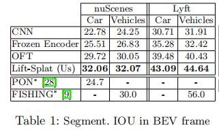 表 1 展示了不同模型在 nuScenes 和 Lyft 数据集上的目标分割 IOU 结果: