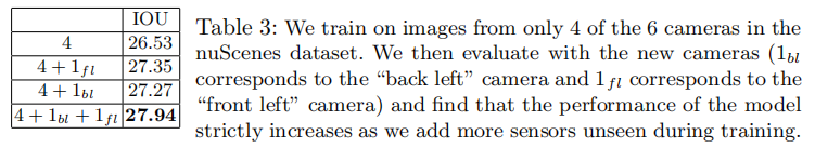 实验 1:训练时仅使用 nuScenes 6 个相机中的 4 个,测试时添加未见过的相机(前左 / 后左),结果如表 3 所示: