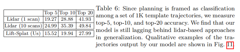 - 多帧激光雷达的性能提升显著,证明时序信息对规划至关重要,未来可通过多帧视觉融合进一步优化。