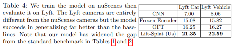 实验 2:在 nuScenes 上训练,直接迁移到 Lyft 相机 rig(相机配置完全不同),结果如表 4 所示: