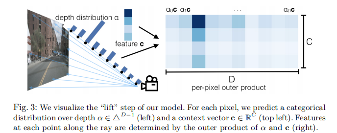 - 深度分布(Depth Distribution):每个像素的深度概率分布 \(\alpha\),用于加权生成 3D 特征。