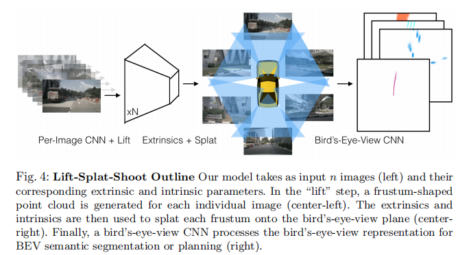 论文提出的架构核心由三步组成:Lift(将图像提升到 3D 视锥体特征)、Splat(将多相机视锥体特征泼洒到 BEV 网格)、Shoot(将轨迹模板投射到 BEV 代价图进行运动规划)。整体流程如图 4 所示: