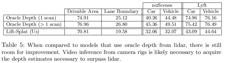 - 在目标分割上仍有差距(32.06 vs 40.26),原因是激光雷达提供精确的 3D 位置,而视觉深度分布存在不确定性;